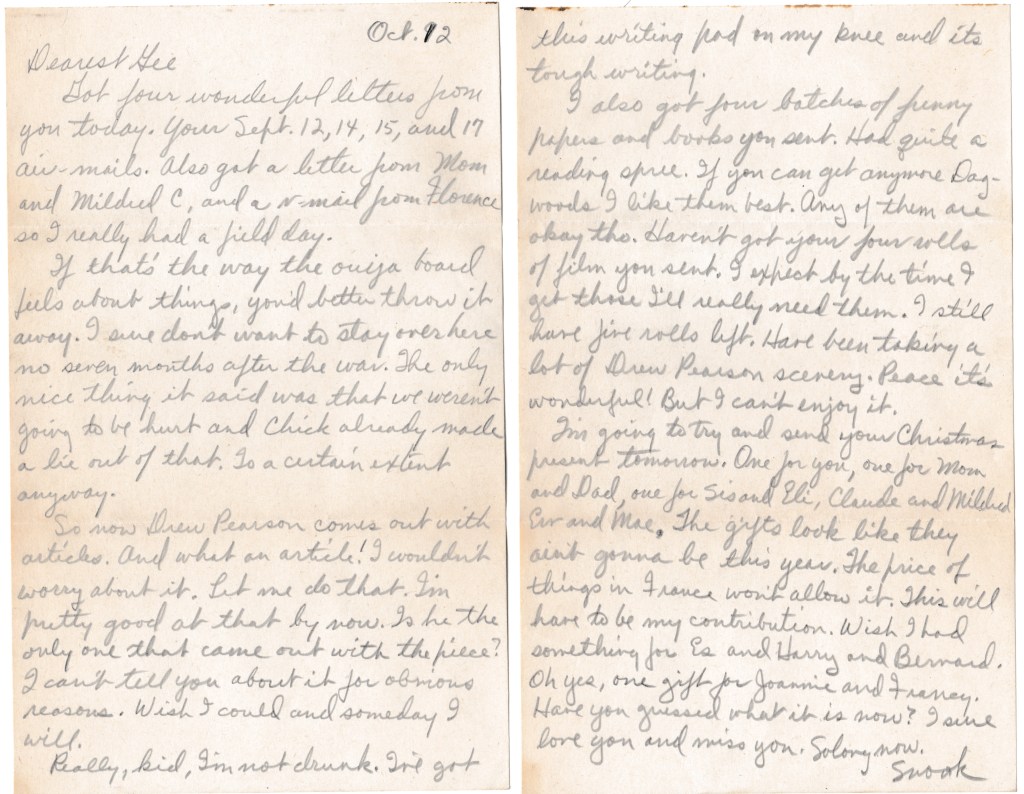 I also got four batches of funny papers and books you sent. Had quite a reading spree. If you can get anymore Dagwoods I like them best. Any of them are okay tho. Haven’t got your four rolls of film you sent. I expect by the time I get those I’ll really need them. I still have five rolls left. Have been taking a lot of Drew Pearson scenery. Peace it’s wonderful! But I can’t enjoy it.