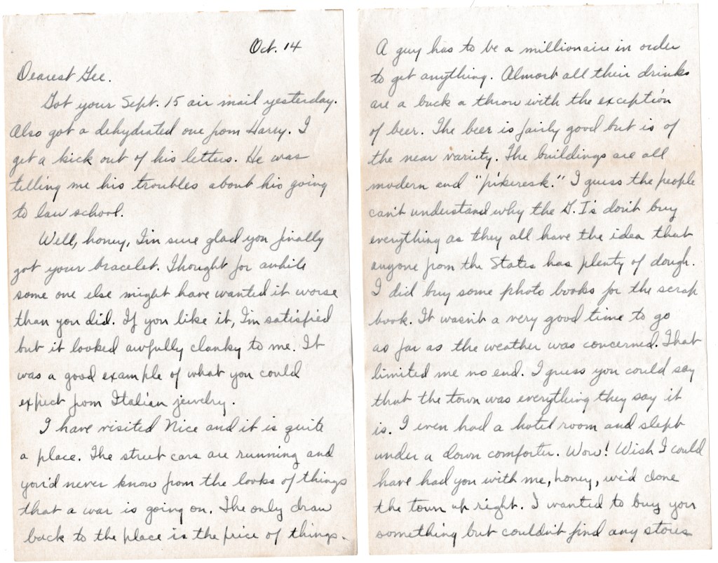 I have visited Nice and it is quite a place. The street cars are running and you’d never know from the looks of things that a war is going on. The only drawback to the place is the price of things. A guy has to be a millionaire in order to get anything. Almost all their drinks are a buck a throw with the exception of beer. The beer is fairly good but it is of the near variety. The buildings are all modern and “pikeresk” [picaresque]. I guess the people can’t understand why the G.I.’s don’t buy everything as they all have the idea that everyone from the States has plenty of dough. I did buy some photo books for the scrapbook. It wasn’t a very good time to go as far as the weather was concerned. That limited me to no end. I guess you could say that the town was everything they say it is. I even had a hotel room and slept under a down comforter. Wow! Wish I could have had you with me, honey, we’d done the town up right. I wanted to buy you something but couldn’t find any stores that were open. I hate to send home junk and yet what I’d like to get always costs a fortune. Ain’t it awful?