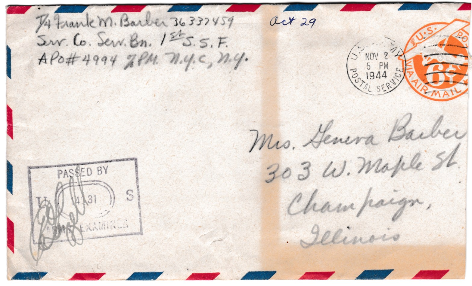 Got your Sept. 20 letter today and two v-mails, one from Dad and one from Mom. Your letters along in there are full of bad news. I have received some v-mails from you with the later dates that were better tho. I sure do hope your hip gets itself ironed out tho. Guess we’ll both have to sweat this war out and then see what can be done. For one thing sure I don’t want you to work. We made a mistake there when we first started off but sometimes your working sho’ helped, didn’t it, kid? We’ll just have to hope that doesn’t happen anymore.