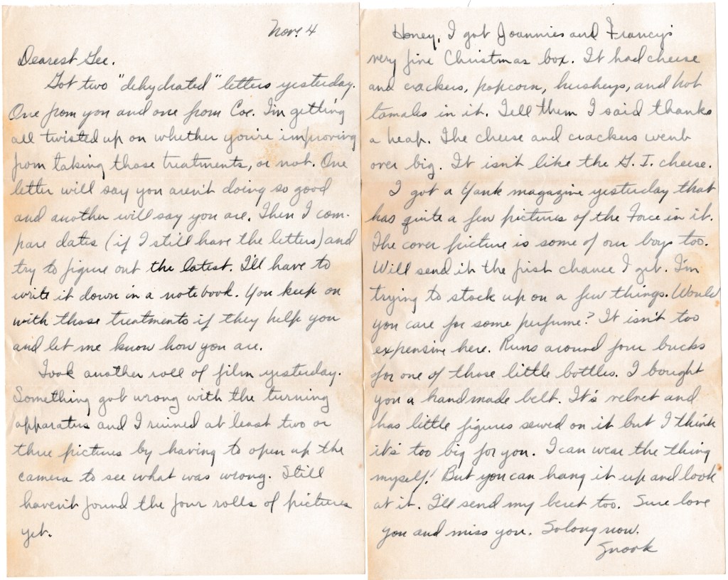 I got a Yank magazine yesterday that has quite a few pictures of the Force in it. The cover picture is some of our boys too. Will send it the first chance I get. I’m trying to stock up on a few things. Would you care for some perfume? It isn’t too expensive here. Runs around four bucks for one of those little bottles. I bought you a handmade belt. It’s velvet and has little figures sewed on it but I think it’s too big for you. I can wear the thing myself! But you can hang it up and look at it. I’ll send you my beret too. Sure love you and miss you.