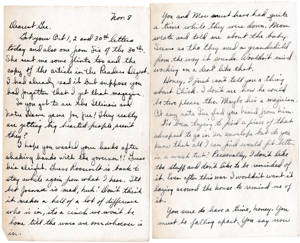I hope you washed your hands after shaking hands with the governor!! Guess he’s alright. Guess Roosevelt is back to stay awhile again from what I hear. I’ll bet Joannie is mad, huh! Don’t think it makes a hell of a lot of difference who is in, it’s a cinch we won’t be home till the wars are over whoever is in.