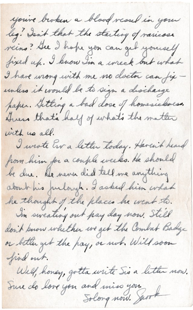 You sure do have a time, honey. You must be falling apart. You say now you’ve broken a blood vessel in your leg? Isn’t that the starting of varicose veins? Gee I hope you can get yourself fixed up. I know I’m a wreck but what I have wrong with me no doctor can fix unless it would be to sign a discharge paper. Getting a bad dose of homesickness. Guess that’s half of what’s the matter with us all.
