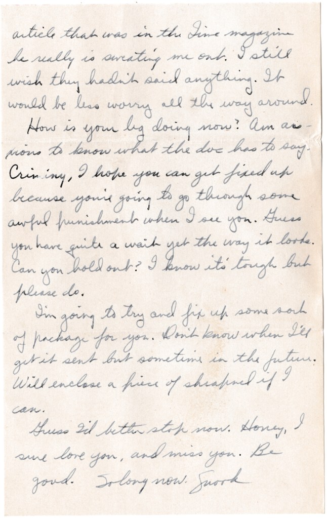Mae was telling me about her visit home. She always writes v-mails but I’m glad to get anything. Erv wrote a three pager. Since you sent him that article that was in the Time magazine he really is sweating me out. I still wish they hadn’t said anything. It would be less worry all the way around.