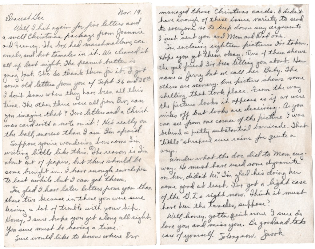 Well, I hit again for five letters and a swell Christmas package from Joannie and Francy. The box had marshmallows, caramels, and hot tamales in it. We cleaned it all up last night. The peanut butter is going fast. Sho do thank them for it. I got some old letters from you of Sept. 26th and 28th. I don’t know where they have been all this time. The other three were all from Erv, can you imagine that? Two letters and a Christmas card with a note on it! He’s really on the ball, moreso than I am I’m afraid.
