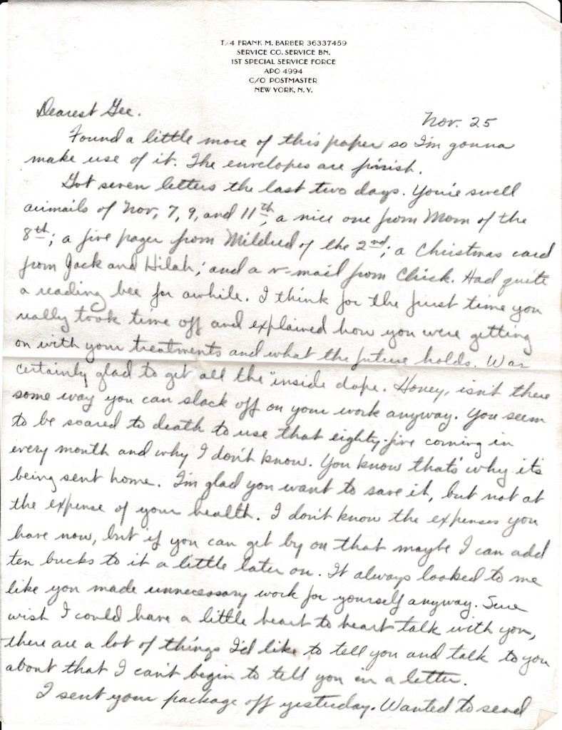 Got seven letters the last two days. Your swell airmails of Nov. 7, 9, and 11th; a nice one from Mom of the 8th; a five pager from Mildred of the 2nd; a Christmas card from Jack and Hilah; and a v-mail from Chick. Had quite a reading bee for awhile. I think for the first time you really took time off and explained how you were getting on with your treatments and what the future holds. Was certainly glad to get all the inside dope. Honey, isn’t there some way you can slack off on your work anyway. You seem to be scared to death to use that eighty-five coming in every month and why I don’t know. You know that’s why it’s being sent home. I’m glad you want to save it, but not at the expense of your health. I don’t know the expenses you have now, but if you can get by on that maybe I can add ten bucks to it a little later on. It always looked to me like you made unnecessary work for yourself anyway. Sure wish I could have a little heart to heart talk with you, there are a lot of things I’d like to tell you and talk to you about that I can’t begin to tell you in a letter.