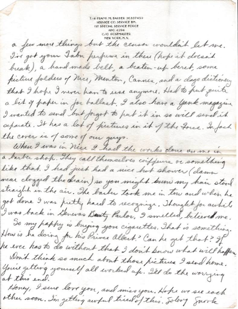 I sent your package off yesterday. Wanted to send a few more things but the censor wouldn’t let me. I’ve got your Tabu perfume in there (hope it doesn’t break), a handmade belt, a beaten-up beret, some picture folders of Nice, Menton, Cannes, and a dago dictionary that I hope I never have to use anymore. Had to put quite a bit of paper in for ballast. I also have a Yank magazine I wanted to send but forgot to put it in so will send it separate. It has a lot of pictures in it of the Force. In fact, the cover is some of our guys.