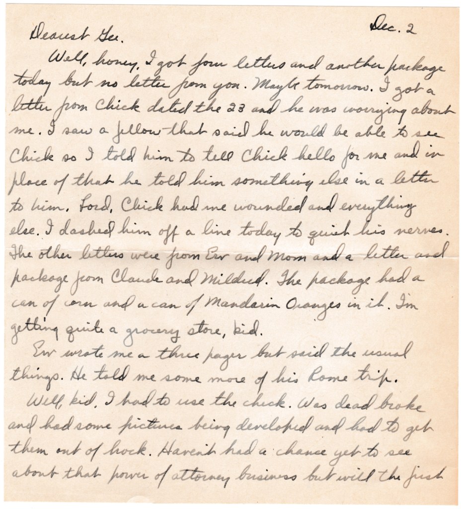 Well, honey, I got four letters and another packaged today but no letter from you. Maybe tomorrow. I got a letter from Chick dated the 23 and he was worrying about me. I saw a fellow that said he would be able to see Chick so I told him to tell Chick hello for me and in place of that he told him something else in a letter to him. Lord, Chick had me wounded and everything else. I dashed him off a line today to quiet his nerves. The other letters were from Erv and Mom and a letter and package from Claude and Mildred. The package had a can of corn and a can of mandarin oranges in it. I’m getting quite a grocery store, kid.