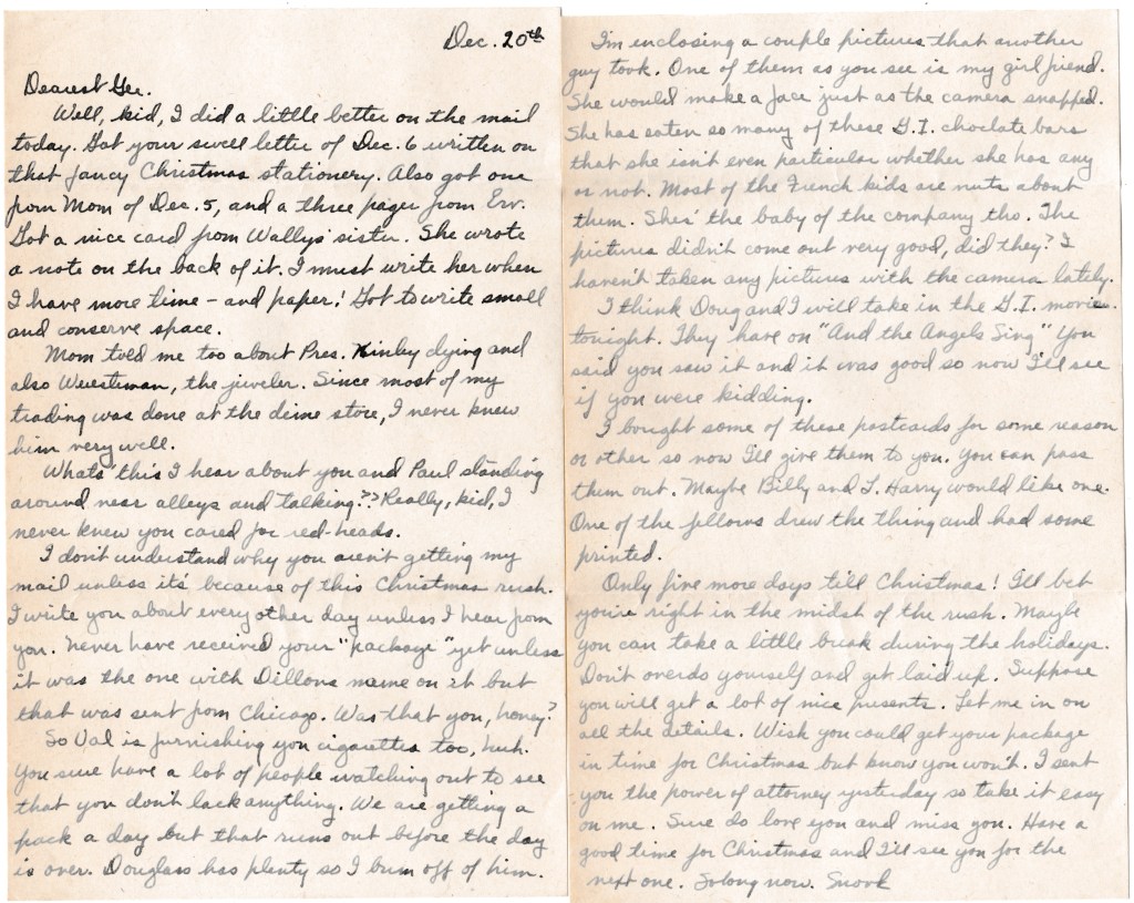 Well, kid, I did a little better on the mail today. Got your swell letter of Dec. 6 written on that fancy Christmas stationary. Also got one from Mom of Dec. 5, and a three pager from Erv. Got a nice card from Wally’s sister. She wrote a note on the back of it. I must write her when I have more time — and paper! Got to write small and conserve space.