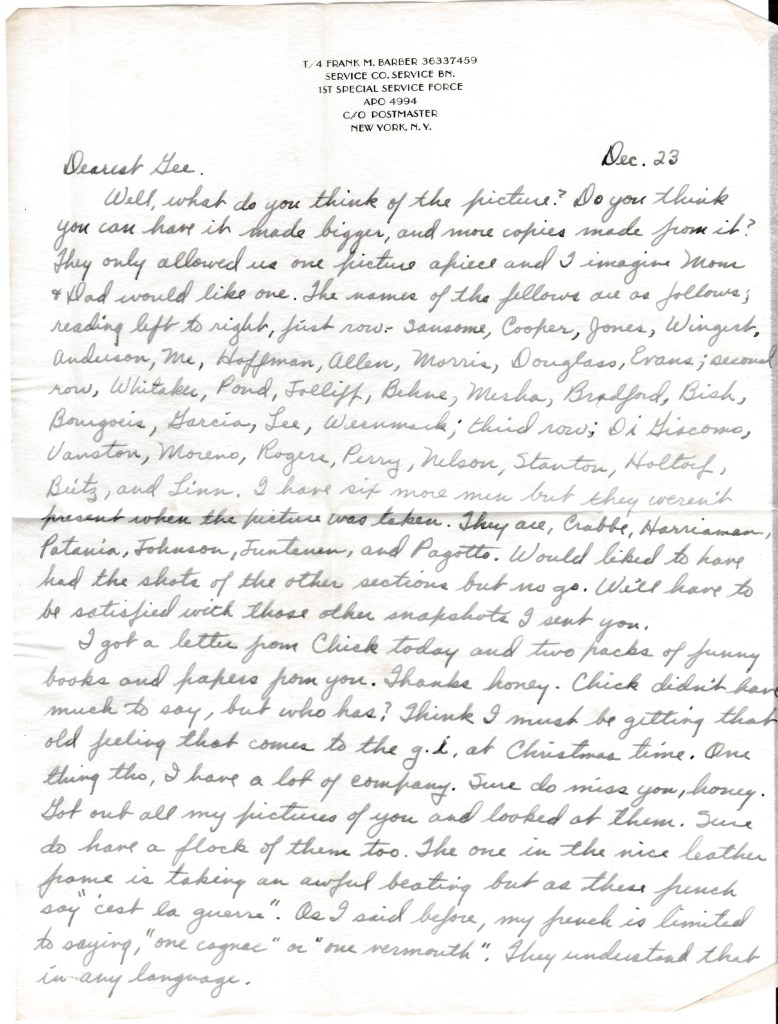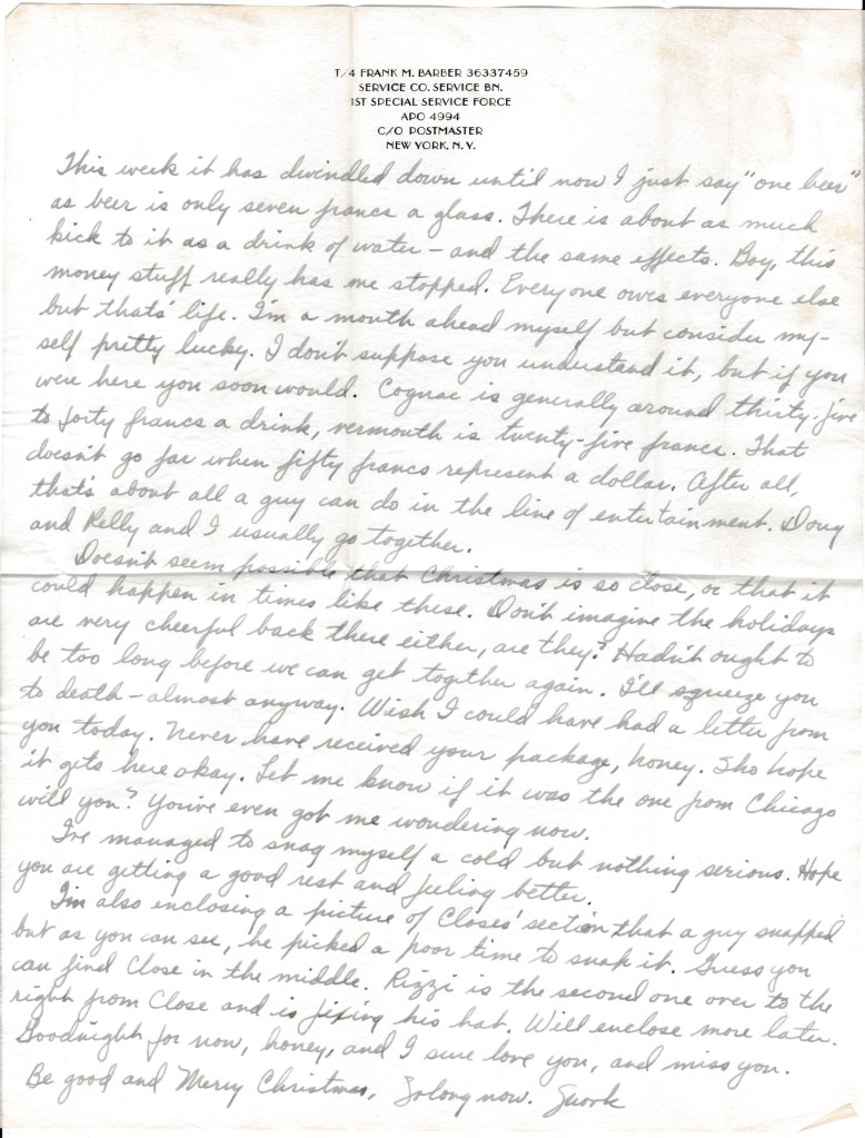 I got a letter from Chick today and two packs of funny books and papers from you. Thanks honey. Chick didn’t have much to say, but who has? Think I must be getting that old feeling that comes to the G.I. at Christmas time. One thing tho, I have a lot of company. Sure do miss you, honey. Got out all my pictures of you and looked at them. Sure do have a flock of them too. The one in the nice leather frame is taking an awful beating but as these French say, “c’est la guerre”. As I said before, my French is limited to saying, “one cognac” or “one vermouth”. They understand that in any language.