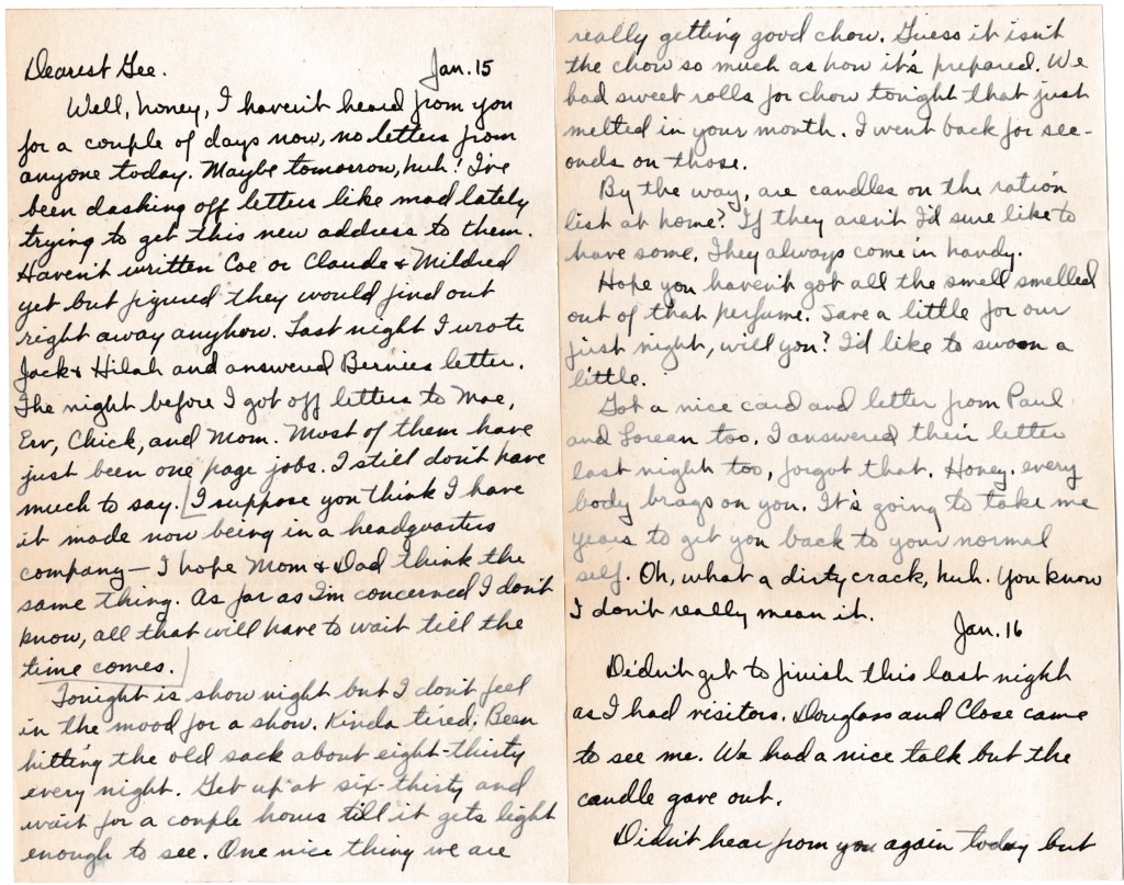 Well, honey, I haven’t heard from you for a couple of days now, no letters from anyone today. Maybe tomorrow, huh! I’ve been dashing off letters like mad lately trying to get this new address to them. Haven’t written Coe or Claude + Mildred yet but figured they would find out right away anyhow. Last night I wrote Jack + Hilah and answered Bernie’s letter. The night before I got off letters to Mae, Erv, Chick, and Mom. Most of them have just been one page jobs. I still don’t have much to say. I suppose you think I have it made now being in a headquarters company — I hope Mom + Dad think the same thing. As far as I’m concerned I don’t know, all that will have to wait till the time comes.