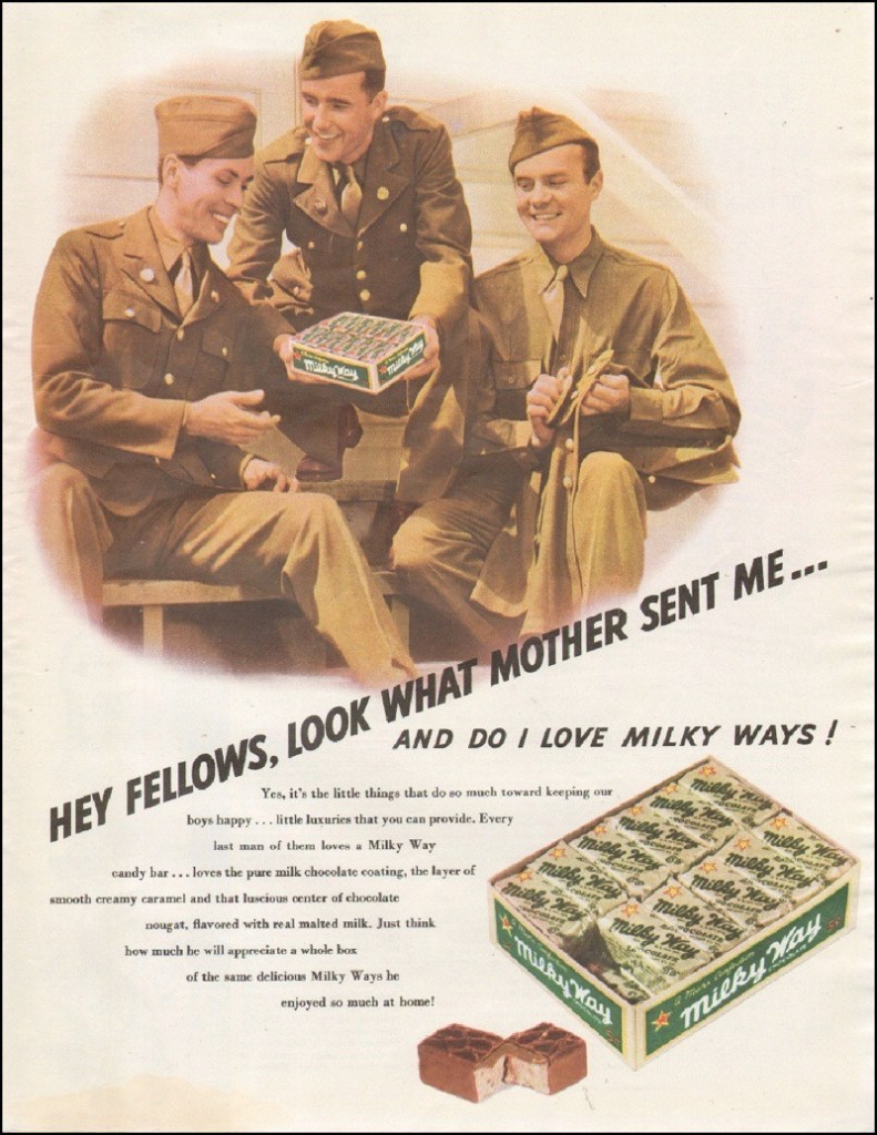 We got our weekly P.X. rations again today so I smoke again for awhile. I rated a package of Velvet pipe tobacco too so I’ll make out okay. Got these Milky War bars and another one of some kind and also this tablet. You’ll even get some more letters. Mom sent me five air mail stamps in her card. I keep them on hand for emergencies.
