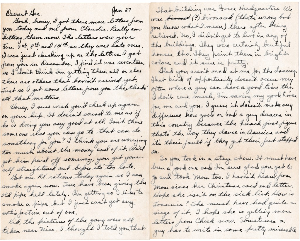Gosh, honey, I got three more letters from you today and one from Claudie. Really am hitting them now. The letters were your Jan. 7th, 8th, and 14th so they were late ones. I was just checking up on the letters I got from you in December. I find it was seventeen so I don’t think I’m getting them all or else there are others that haven’t arrived yet. Just so I get some letters from you tho, that’s all that matters.