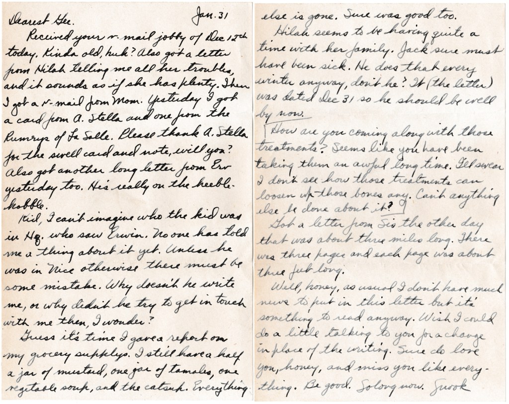 Received your v-mail jobs of Dec. 12th today. Kinda old, huh? Also got a letter from Hilah telling me all her troubles, and it sounds as if she has plenty. Then I got a v-mail from Mom. Yesterday I got a card from Aunt Stella and one from the Rumrys of La Salle. Please thank A. Stella for the swell card and note, will you? Also got another long letter from Erv yesterday too. He’s really on the heeble-hobble.