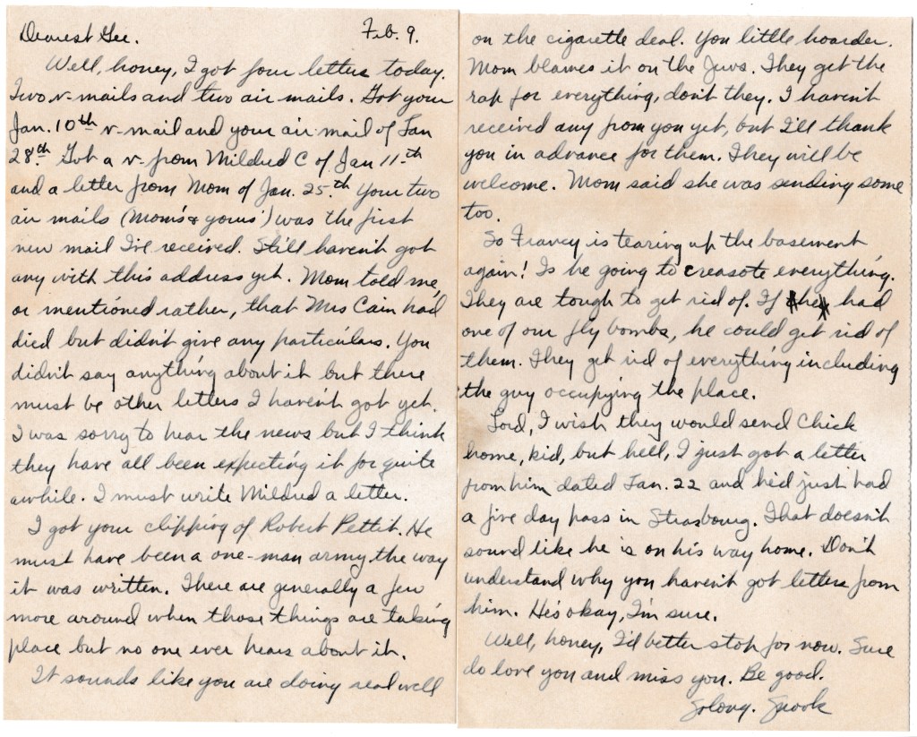 Lord, I wish they would send Chick home, kid, but hell, I just got a letter from him dated Jan. 22 and he’d just had a five day pass in Strasbourg. That doesn’t sound like he is on his way home. Don’t understand why you haven’t got letters from him. He’s okay, I’m sure.