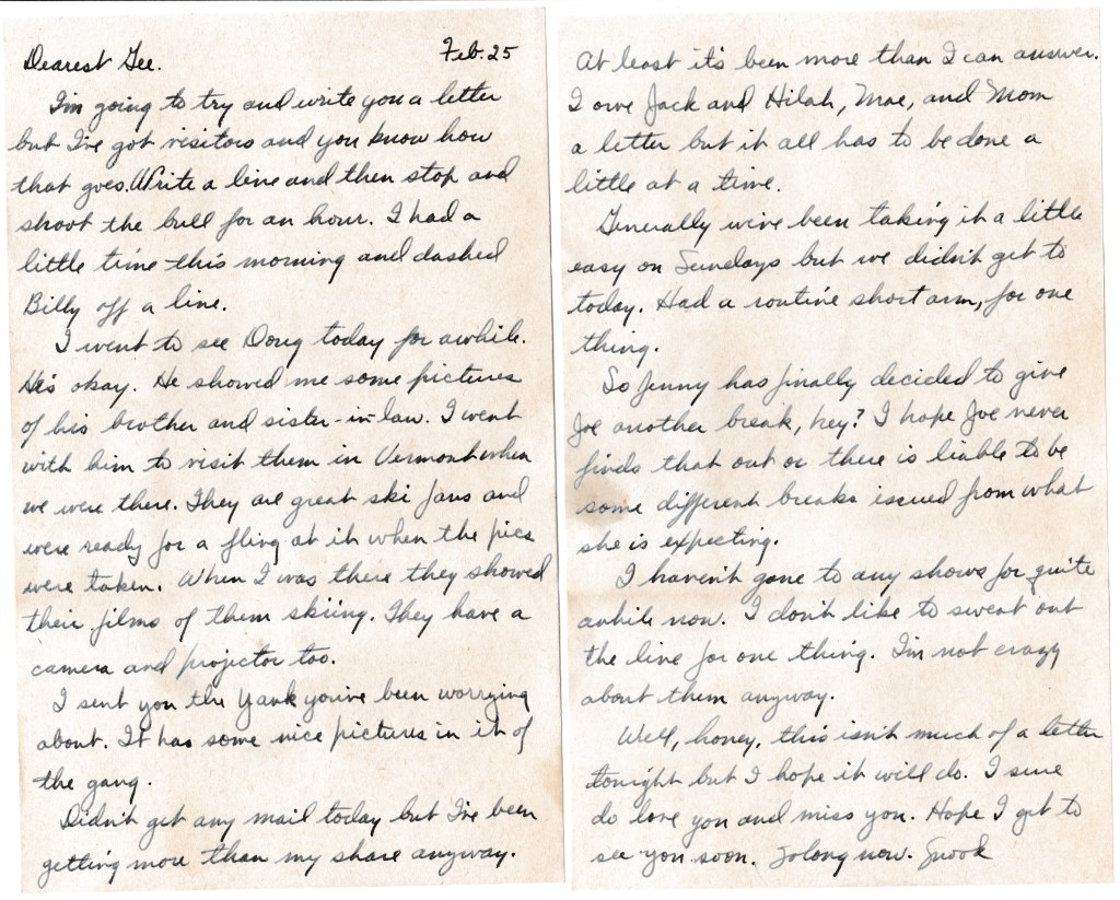 I’m going to try and write you a letter but I’ve got visitors and you know how that goes. Write a line and then stop and shoot the bull for an hour. I had a little time this morning and dashed Billy off a line.