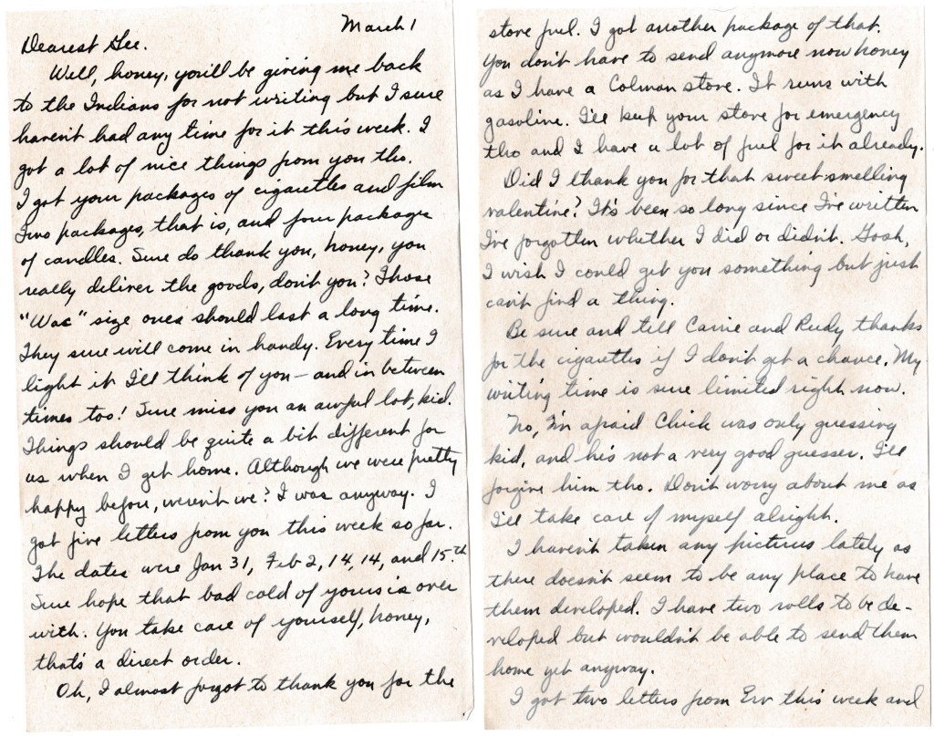 Well, honey, you’ll be giving me back to the Indians for not writing but I sure haven’t had any time for it this week. I got a lot of nice things from you tho. I got your package of cigarettes and film. Two packages, that is, and four packages of candles. Sure do thank you, honey, you really deliver the goods, don’t you? Those “Wac” size ones should last a long time. They sure will come in handy. Every time I light it I’ll think of you — and in-between times too! Sure miss you an awful lot, kid. Things should be quite a bit different for us when I get home. Although we were pretty happy before, weren’t we? I was anyway. I got five letters from you this week so far. The dates were Jan 31, Feb 2, 14, 14, and 15th. Sure hope that bad cold of yours is over with. You take care of yourself, honey, that’s a direct order.