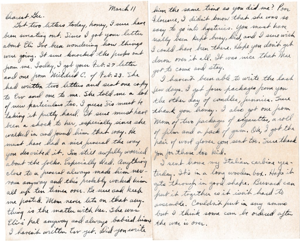 Got two letters today, honey, I sure have been sweating out. Since I got your letter about Eli I’ve been wondering how things were going. It sure knocked the props out from me. Today, I got your Feb. 27 letter and one from Mildred C. Of Feb. 23. She had written two letters and sent one copy to Erv and one to me. She told me a lot of new particulars too. I guess Sis must be taking it pretty hard. It sure must have been a shock to her, especially since she walked in and found him that way. He must have had a nice funeral the way you described it. I’m still awfully worried about the folks. Especially Dad. Anything close to a funeral always makes him nervous anyway and this probably worked him all up ten times over. Be sure and keep me posted. Mom never lets on that anything is the matter with her. She was Eli’s pal anyway and always babied him. I haven’t written Erv yet. Did you write him the same time as you did me? Poor Florence, I didn’t know that she was so easy to go into hysterics. You must have really been kept busy, kid, and I sure wish I could have been there. Hope you don’t get down over it all. It was nice that Mae got to come and stay.