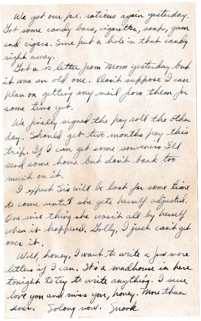 We finally signed the payroll the other day. Should get two months pay this trip. If I can get some souvenirs I’ll send some home but don’t bank too much on it.