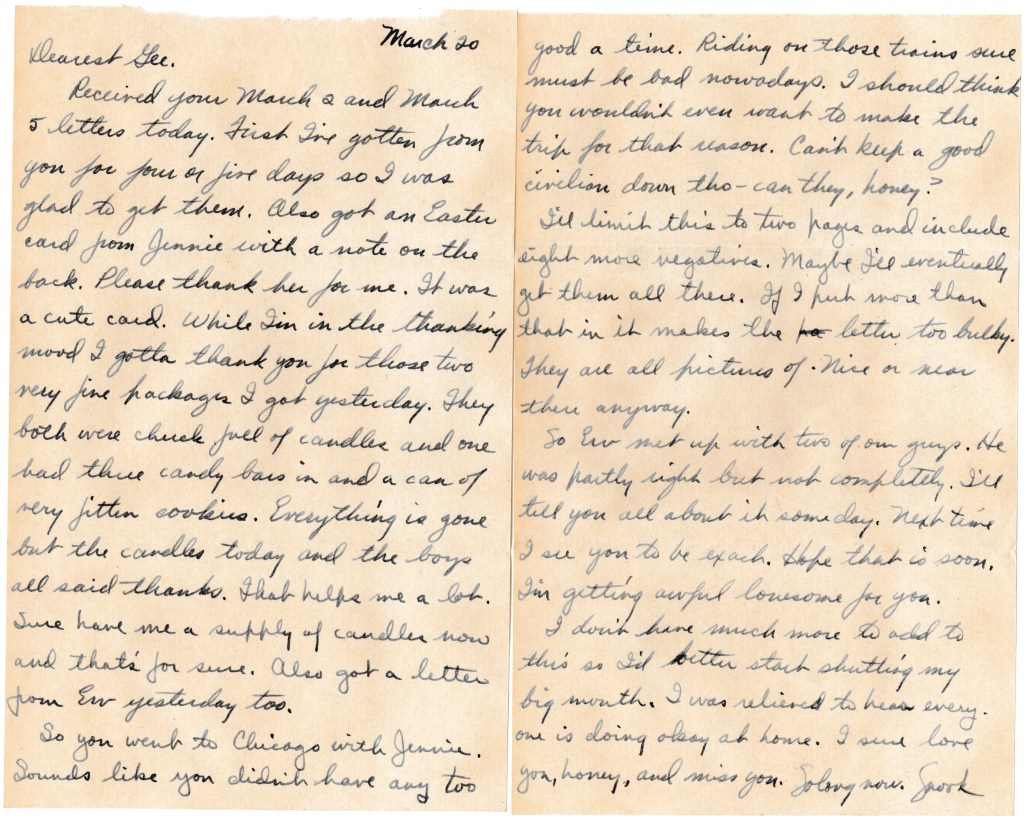 Received your March 2 and March 5 letters today. First I’ve gotten from you for four or five days so I was glad to get them. Also got an Easter card from Jennie with a note on the back. Please thank her for me. It was a cute card. While I’m on the thanking mood I gotta thank you for those two very fine packages I got yesterday. They both were chuck full of candles and one had three candy bars in [it] and a can of very fittin’ cookies. Everything is gone but the candles today and the boys all said thanks. That helps me a lot. Sure have me a supply of candles now and that’s for sure. Also got a letter from Erv yesterday too.