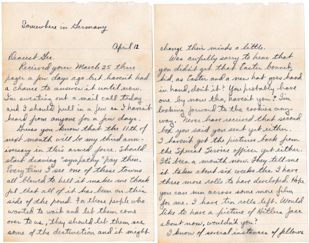 Was awfully sorry to hear that you didn’t get that Easter bonnet, kid, as Easter and a new hat goes hand in hand, don’t it? You probably have one by now tho, haven’t you? I’m looking forward to the cookies anyway. Never have received that second box you said you sent yet either. I haven’t got the pictures back from the Special Service officer yet either. It’s been a month now. They tell me it takes about six weeks tho. I have three more rolls to have developed. Hope you can run across some more film for me. I have ten rolls left. Would like to have a picture Hitler’s face about now, wouldn’t you?