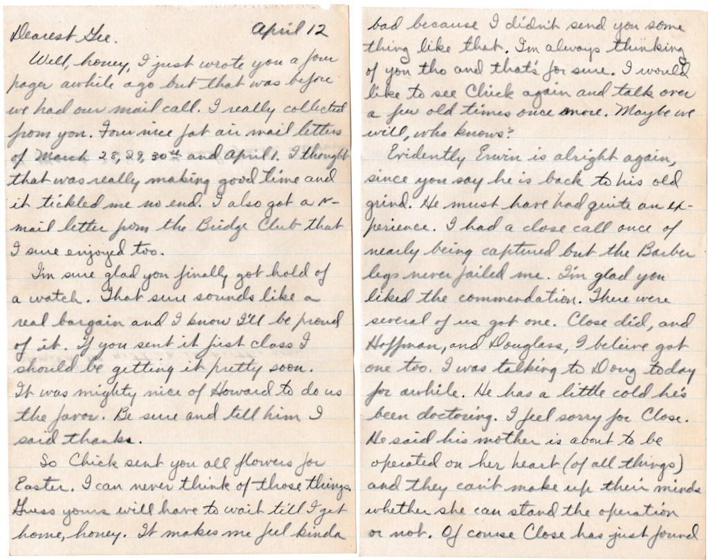 Well, honey, I just wrote you a four pager awhile ago but that was before we had our mail call. I really collected from you. Four nice fat air mail letters of March 28, 29, 30th and April 1. I thought that was really making good time and it tickled me no end. I also got a v-mail letter from the Bridge Club that I sure enjoyed too.