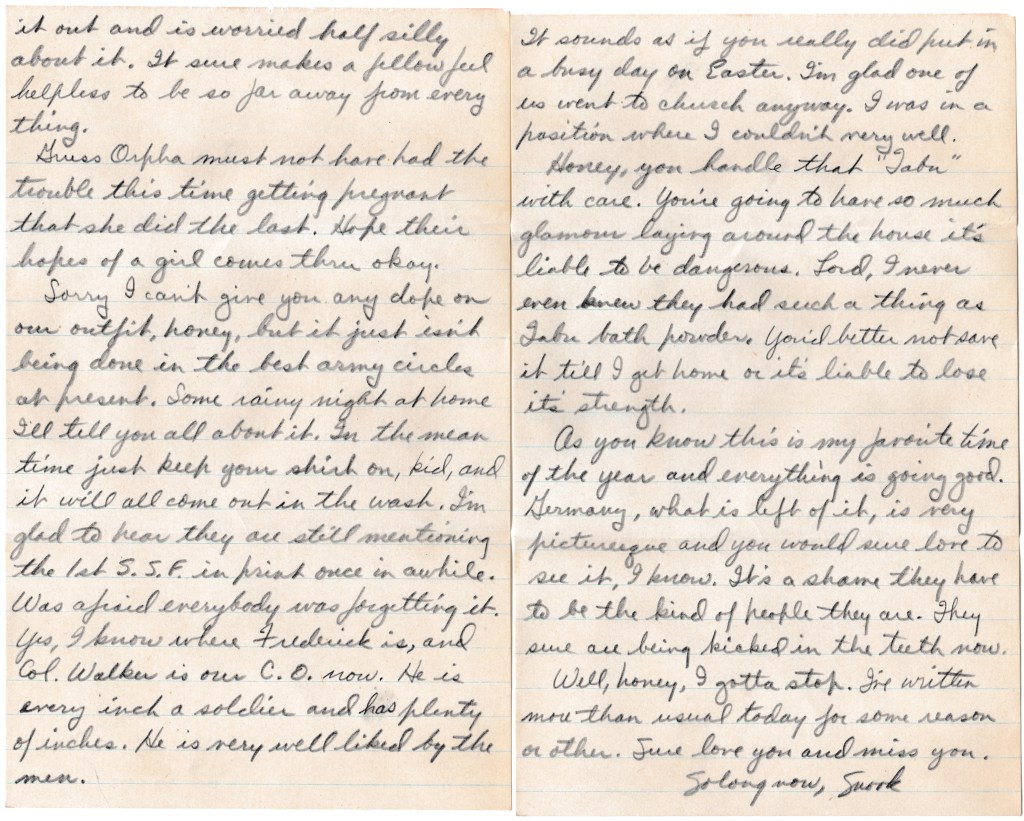 So Chick sent you all flowers for Easter. I can never think of those things. Guess yours will have to wait till I get home, honey. It makes me feel kinda bad because I didn’t send you something like that. I’m always thinking of you tho and that’s for sure. I would like to see Chick again and talk over a few old times once more. Maybe we will, who knows?