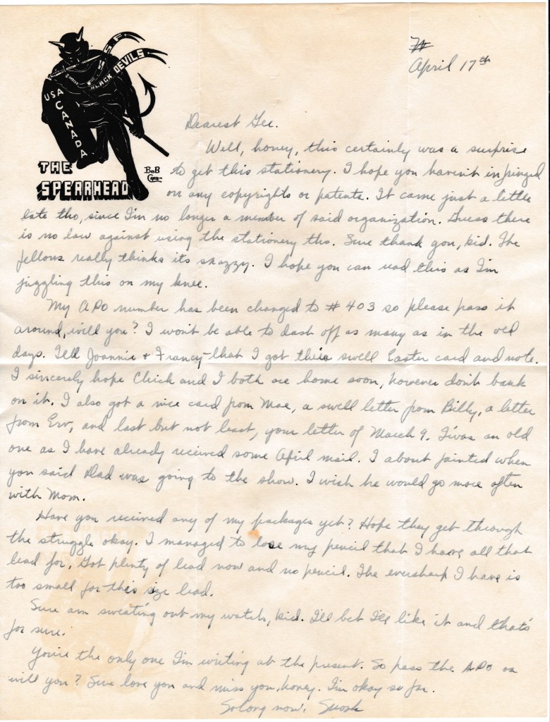 My APO number has been changed to #403 so please pass it around, will you? I won’t be able to dash off as many as in the old days. Tell Joannie + Francy that I got their swell Easter card and note. I sincerely hope Chick and I both are home soon, however don’t bank on it. I also got a nice card from Mae, a swell letter from Billy, a letter from Erv, and last but not least, your letter of March 9. Twas an old one as I have already received some April mail. I about fainted when you said Dad was going to the show. I wish he could go more often with Mom.