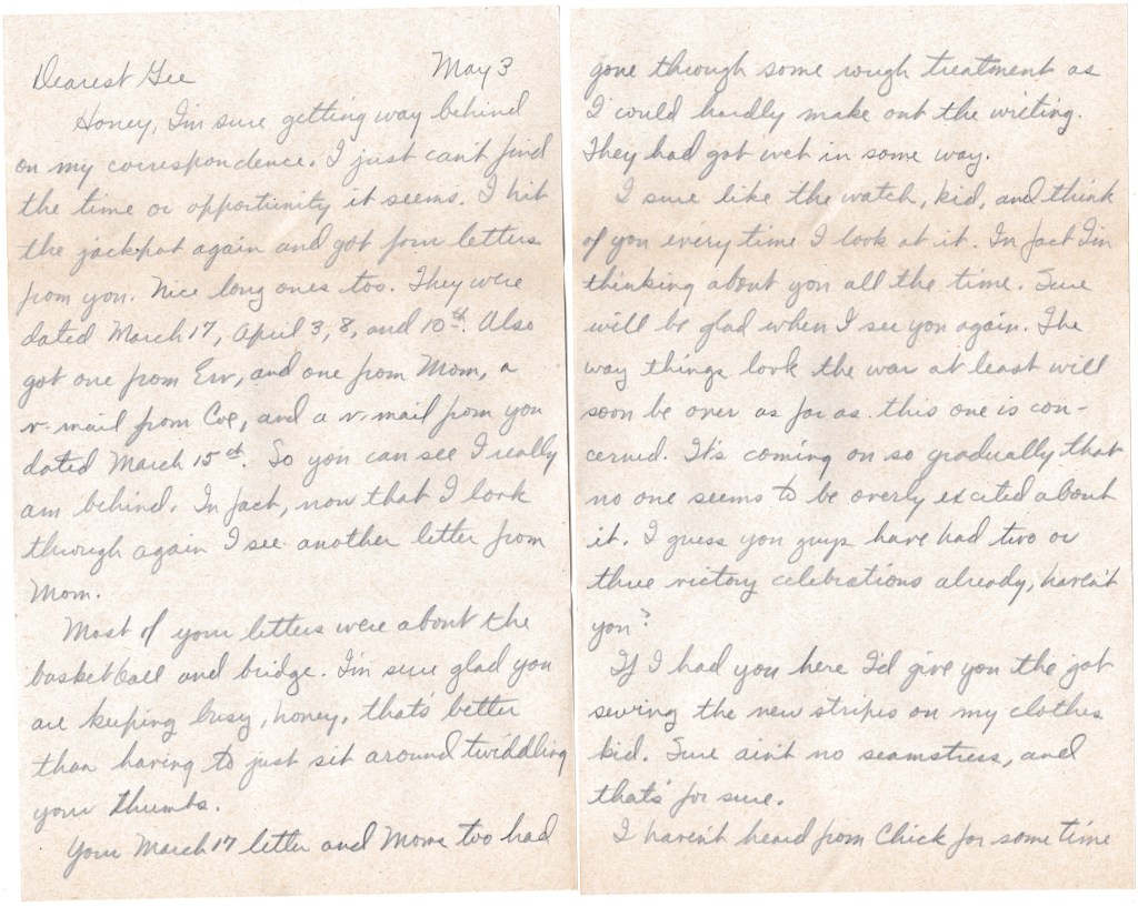 I sure like the watch, kid, and think of you every time I look at it. In fact, I’m thinking about you all the time. Sure will be glad when I see you again. The way things look the war at least will soon be over as far as this one is concerned. It’s coming on so gradually that no one seems to be overly excited about it. I guess you guys have had two or three victory celebrations already, haven’t you?