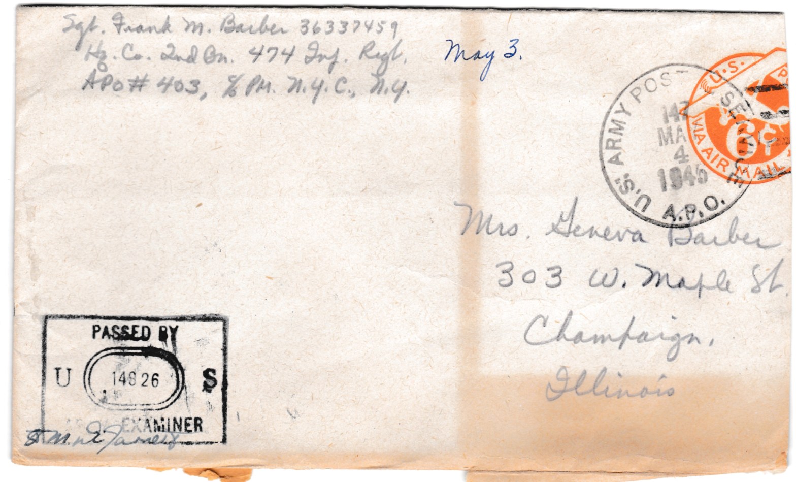 Honey, I’m sure getting way behind on my correspondence. I just can’t find the time or opportunity it seems. I hit the jackpot again and got four letters from you. Nice long ones too. They were dated March 17, April 3, 8, and 10th. Also got one from Erv, and one from Mom, a v-mail from Coe, and a v-mail from you dated March 15th. So you can see I really am behind. In fact, now that I look through again I see another letter from Mom.