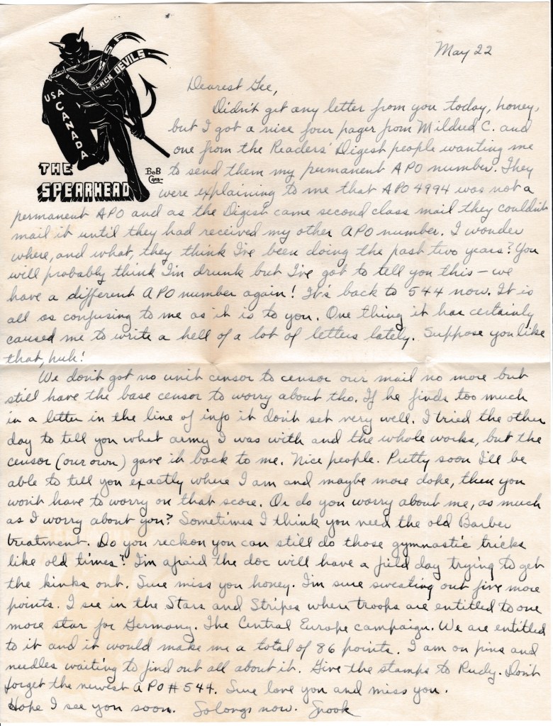 We don’t got no unit censor to censor our mail no more but still have the base censor to worry about tho. If he finds too much in a letter in the line of info it don’t set very well. I tried the other day to tell you what army I was with and the whole works, but the censor (our own) gave it back to me. Nice people. Pretty soon I’ll be able to tell you exactly where I am and maybe more dope, then you won’t have to worry on that score. Or do you worry about me as much as I worry about you? Sometimes I think you need the old Barber treatment. Do you reckon you can still do those gymnastic tricks like old times? I’m afraid the doc will have a field day trying to get the kinks out. Sure miss you, honey. I’m sure sweating out five more points. I see in the Stars and Stripes where troops are entitled to one more star for Germany. The Central Europe campaign. We are entitled to it and it would make me a total of 86 points. I am on pins and needles waiting to find out all about it. Give the stamps to Rudy. Don’t forget the newest APO #544. Sure love you and miss you. Hope I see you soon.
