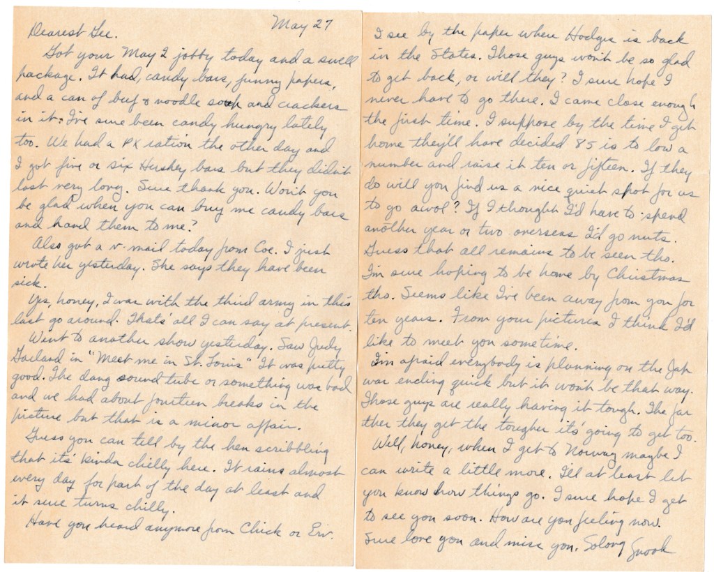 Got your May 2 jobby today and a swell package. It had candy bars, funny papers, and a can of beef + noodle soup and crackers in it. I’ve sure been candy hungry lately to. We had a PX ration the other day and I got five or six Hershey bars but they didn’t last very long. Sure thank you. Won’t you be glad when you can buy me candy bars and hand them to me?