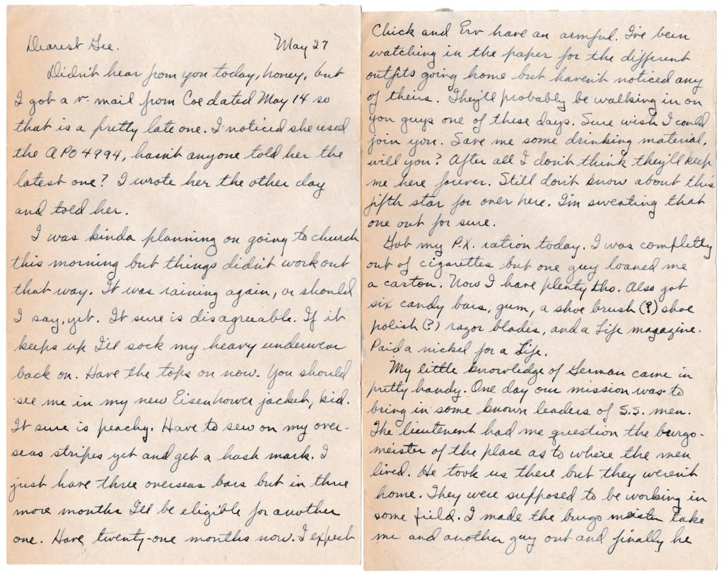 I was kinda planning on going to church this morning but things didn’t work out that way. It was raining again, or should I say, yet. It sure is disagreeable. If it keeps up I’ll sock my heavy underwear back on. Have the tops on now. You should see me in my new Eisenhower jacket, kid. It sure is peachy. Have to sew on my overseas stripes yet and get a hash mark. I just have three overseas bars but in three months I’ll be eligible for another one. Have twenty-one months now. I expect Chick and Erv have an armful. I’ve been watching in the papers for the different outfits going home but haven’t noticed any of theirs. They’ll probably be walking in on you guys one of these days. Sure wish I could join you. Save me some drinking material will you? After all I don’t think they’ll keep me here forever. Still don’t know about this fifth star for over here. I’m sweating that one out for sure.