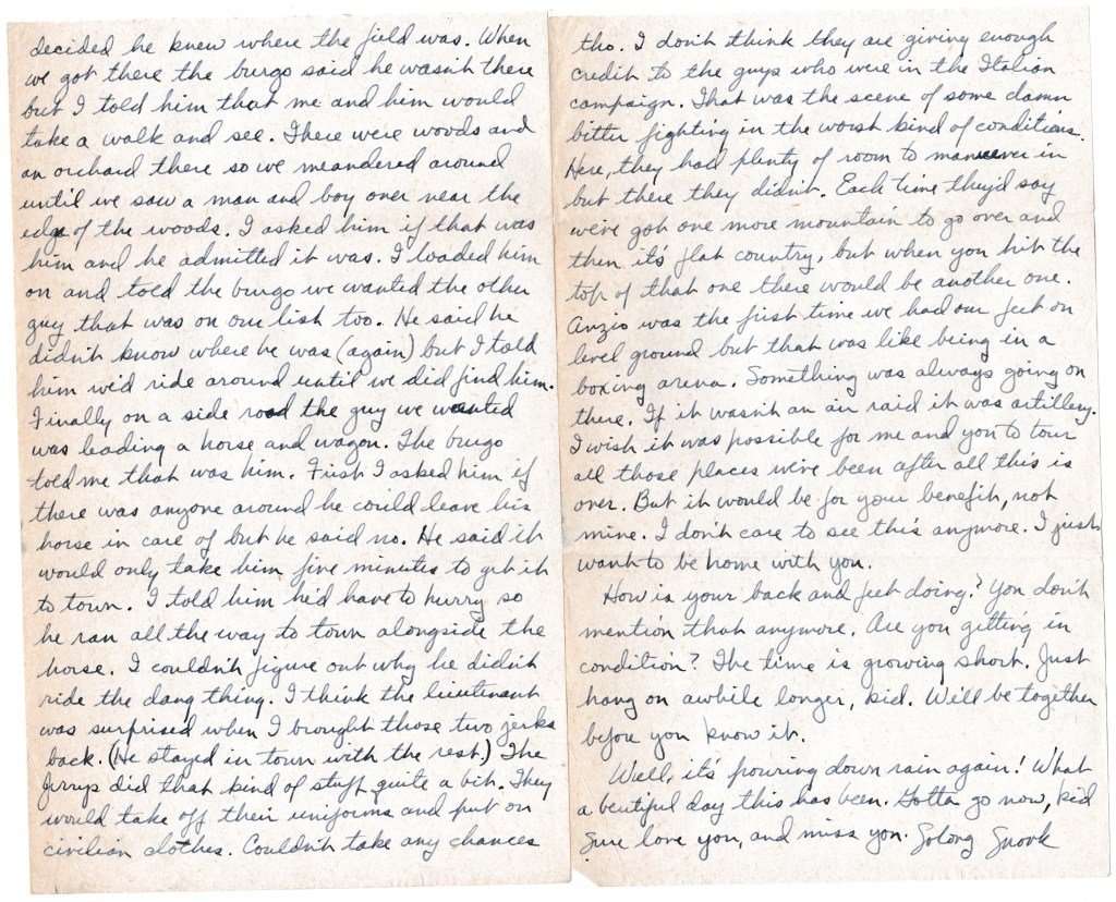 My little knowledge of German came in pretty handy. One day one mission was to bring in some known leaders of S.S. men. The lieutenant had me question the burgomeister of the place as to where the men lived. He took us there but they weren’t home. They were supposed to be working in some field. I made the burgomeister take me and another guy out and finally he knew where the field was. When we got there the burgo said he wasn’t there but I told him that me and him would take a walk and see. There were woods and an orchard there so we meandered around until we saw a man and boy over near the edge of the woods, I asked him if that was him and he admitted it was. I loaded him on and told the burgo we wanted the other guy that was on one list too. He said he didn’t know where he was (again) but I told him we’d ride around until we did find him. Finally on a side of a road the guy we wanted was loading a horse and wagon. The burgo told me that was him. First I asked him if there was anyone around he could leave his horse in care of but he said no. He said it would only take him five minutes to get it to town. I told him he’d have to hurry so he ran all the way to town alongside the horse. I couldn’t figure out why he didn’t ride the dang thing. I think the lieutenant was surprised when I brought those two jerks back (He stayed in town with the rest). The Jerrys did that kind of stuff quite a bit. They would take off their uniforms and put on civilian clothes. Couldn’t take any chances tho. I don’t think they are giving enough credit to the guys who were in the Italian campaign. That was the scene of some damn bitter fighting in the worst kind of conditions. Here they had plenty of room to maneuver in but there they didn’t. Each time they’d say we’ve got one more mountain to go over and they it’s flat country, but when you hit the top of that one there would be another one. Anzio was the first time we had our feet on level ground but that was like being in a boxing arena. Something was always going on in there. If it wasn’t an air raid it was artillery. I wish it was possible for me and you to tour all those places we’ve been after all this is over. But it would be for your benefit, not mine. I don’t care to see this anymore. I just want to be home with you.