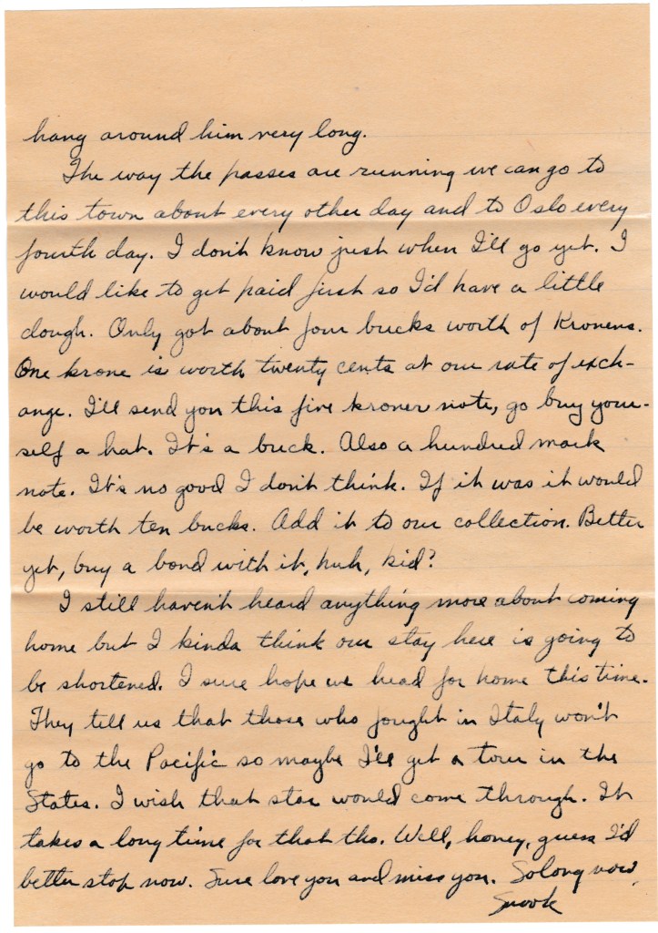 The way passes are running we can go to this town about every other day and to Oslo every fourth day. I don’t know just when I’ll go yet. I would like to get paid first so I’d have a little dough. Only got about four bucks worth of Kroners. One krone is worth twenty cents at our rate of exchange. I’ll send you this five kroner note, go buy yourself a hat. It’s a buck. Also a hundred mark note. It’s no good I don’t think. If it was it would be worth ten bucks. Add it to our collection. Better yet, buy a bond with it, huh, kid?