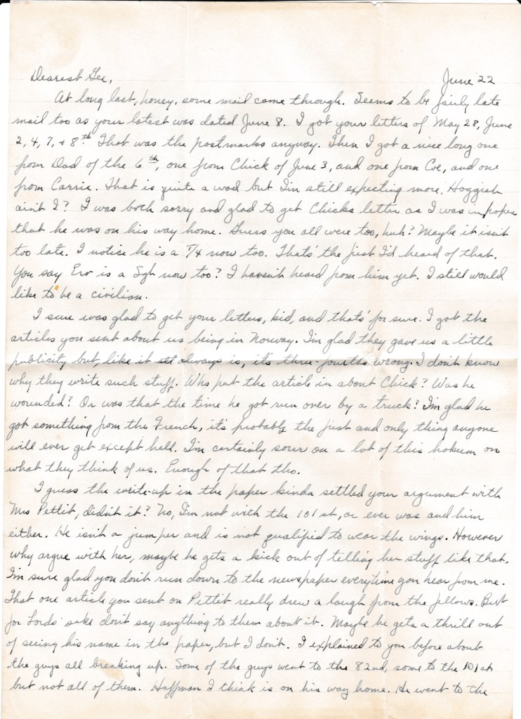 I sure was glad to get your letters, kid, and that’s for sure. I got the articles you sent about us being in Norway. I’m glad they gave us a little publicity, but like it always is, it’s three-fourths wrong. I don’t know why they write such stuff. Who put the article in about Chick? Was he wounded? Or was that the time he got run over by a truck? I’m glad he got something from the French, it’s probably the first and only thing anyone will ever get except hell. I’m certainly sour on a lot of this hokum on what they think of us. Enough of that tho.