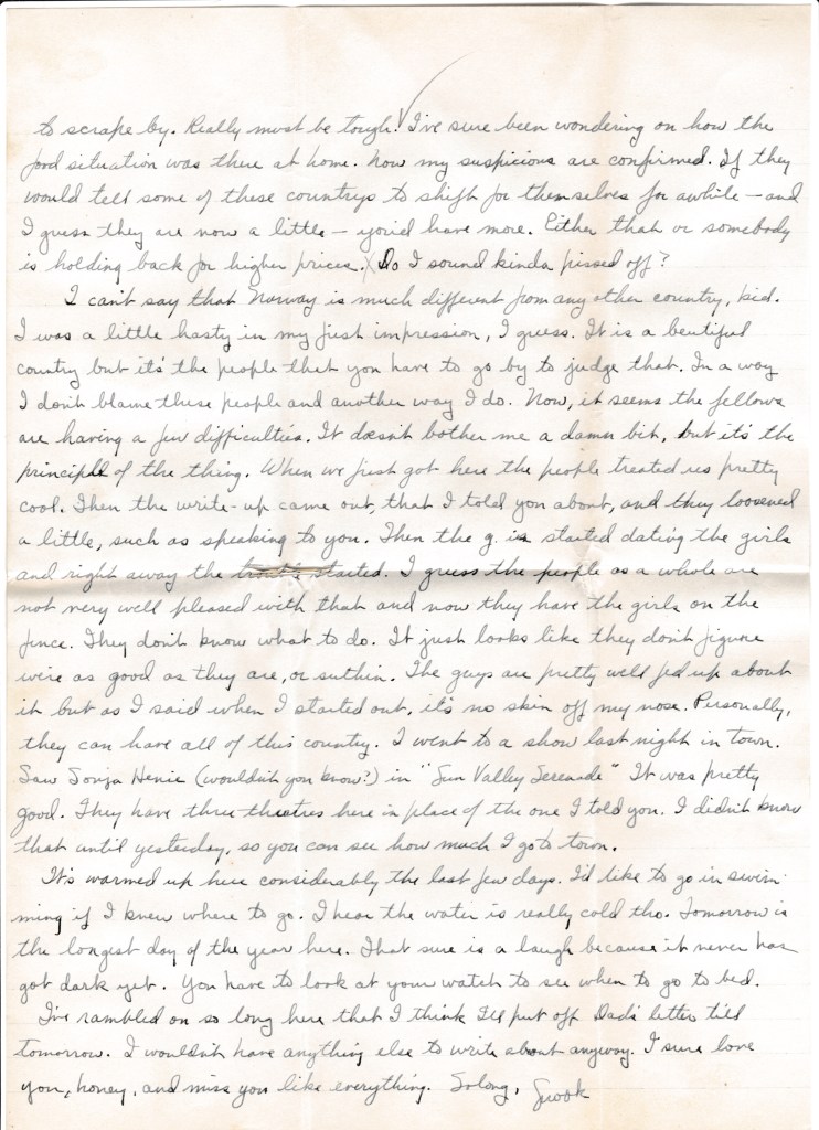I can’t say that Norway is much different from any other country, kid. I was a little hasty in my first impression, I guess. It is a beautiful country but it’s the people that you have to go by to judge that. In a way I don’t blame these people and another way I do. Now, it seems the fellows are having a few difficulties. It doesn’t bother me a damn bit, but it’s the principle of the thing. When we first got here the people treated us pretty cool. Then the write-up came out, that I told you about, and they loosened a little, such as speaking to you. Then the G.I.s started dating the girls and right away the trouble started. I guess the people as a whole are not very well pleased with that and now they have the girls on the fence. They don’t know what to do. It just looks like they don’t figure we’re as good as they are, or suthin. The guys are pretty well fed up about it but as I said when I started out, it’s no skin off my nose. Personally they can have all of this country. I went to a show last night in town. Saw Sonja Henie (wouldn’t you know?) in “Sun Valley Serenade”. It was pretty good. They have three theatres here in place of the one I told you. I didn’t know that until yesterday, so you can see how much I go to town.