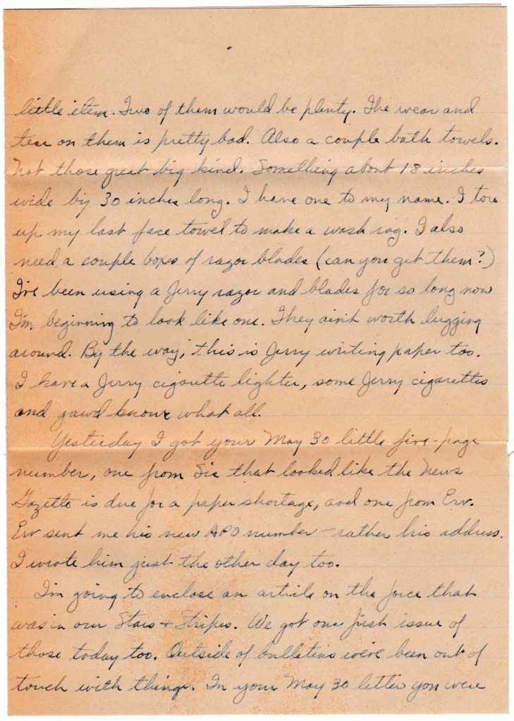 I’m going to enclose an article on the Force that was in our Stars + Stripes. We got our first issue of those today too. Outside of bulletins we’ve been out of touch with things. In your May 30 letter you were considerably pissed off I would say, because I’m not being sent home right away and was sent here. I’m just sweating out the other five points we’re supposed to get then I’ll feel a little safer. Please, don’t get discouraged, honey, as it’s just as bad for me too.