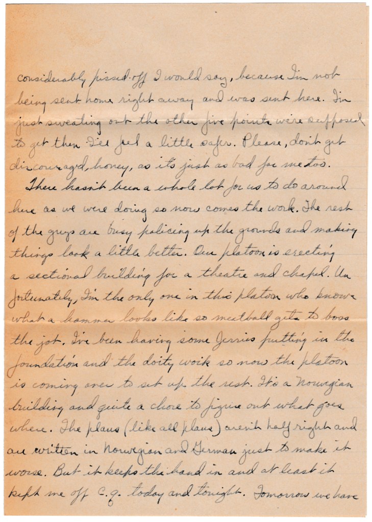 There hasn’t been a whole lot for us to do around here as we were doing so now comes the work. The rest of the guys are busy policing up the grounds and making things look a little better. Our platoon is erecting a sectional building for a theatre and chapel. Unfortunately, I’m the only one in this platoon who knows what a hammer looks like so meatball gets to boss the job. I’ve been having some Jerries putting in the foundations and the doity work so now the platoon is coming over to set up the rest. It’s a Norwegian building and quite a chore to figure out what goes where. The plans (like all plans) aren’t half right and are written in Norwegian and German just to make it worse. But it keeps the hand in and at least it kept me off C.Q. today and tonight. Tomorrow we have a dress rehearsal for the 4th of July parade. It’s rained the last three days and tomorrow doesn’t look like any exception. I dread to think what the fourth will be. We will probably be issued water wings for that day.