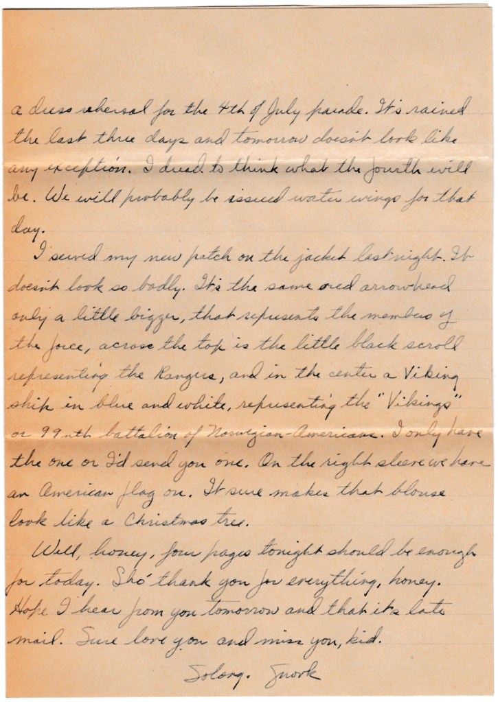 I sewed my new patch on the jacket last night. It doesn’t look so badly. It’s the same red arrowhead only a little bigger, that represents the members of the Force, across the top is the little black scroll representing the Rangers, and in the center a Viking ship in blue and white, representing the “Vikings” or 99th battalion of Norwegian-Americans. I only have the one or I’d send you one. On the right sleeve we have an American flag on. It sure makes that blouse look like a Christmas tree.
