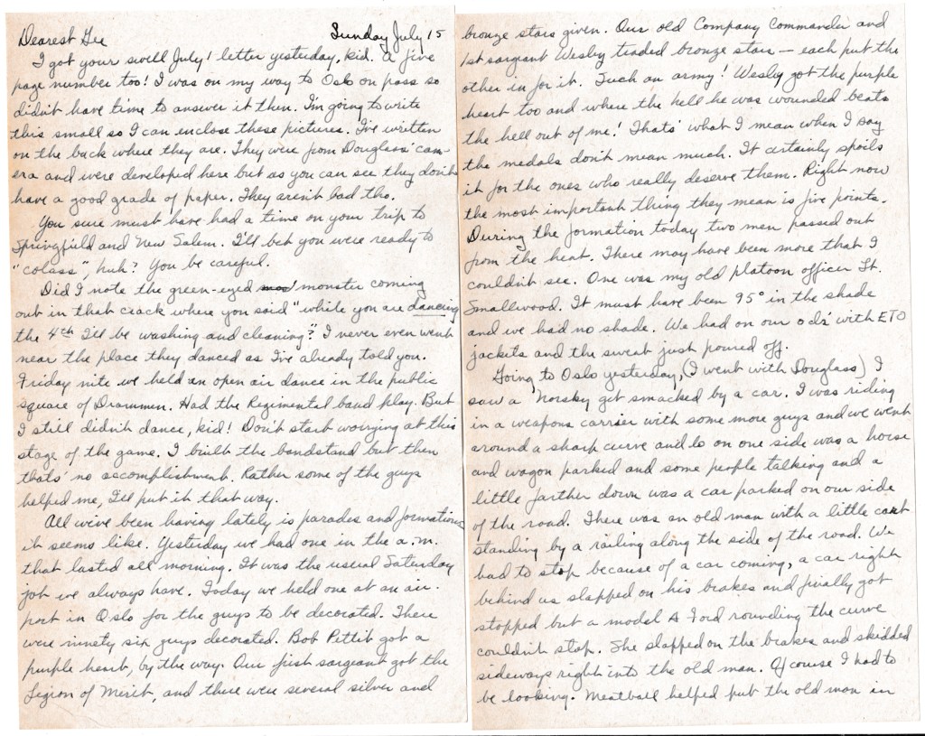 All we’ve been having lately is parades and formations it seems like. Yesterday we had one in the a.m. that lasted all morning. It was the second Saturday job we always have. Today we held one at an airport in Oslo for the guys to be decorated. There were ninety-six guys decorated. Bob Petit got a Purple Heart, by the way. Our first sergeant got the Legion of Merit, and there were several silver and bronze stars given. Our old Company Commander and 1st sergeant Wesley traded bronze stars — each put the other in for it. Such an army! Wesley got the Purple Heart too and where the hell he was wounded beats the hell out of me! That’s what I mean when I say the medals don’t mean much. It certainly spoils it for the ones who really deserve them. Right now the most important thing they mean is five points. During the formation today two men passed out from the heat. There may have been more that I couldn’t see. One was my old platoon officer Lt. Smallwood. It must have been 95° in the shade and we had no shade. We had on our od’s with ETO jackets and the sweat just poured off.