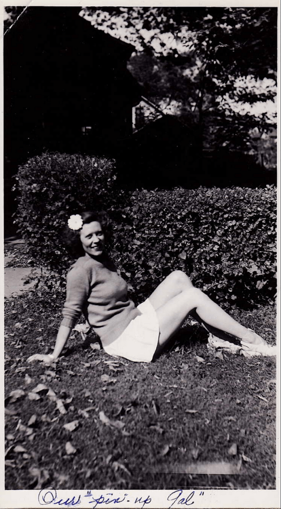 Honey, I sure will be thinking about you on our anniversary. I sure wish I could be with you. Sure hope we can spend the ninth one together at least. I have your folder you sent me tacked up on the wall beside my bunk. In the other half I got the one of you in shorts and sweater sitting in the grass. I don’t have a good picture of Dad and Mom. I wish they’d have their picture taken together.