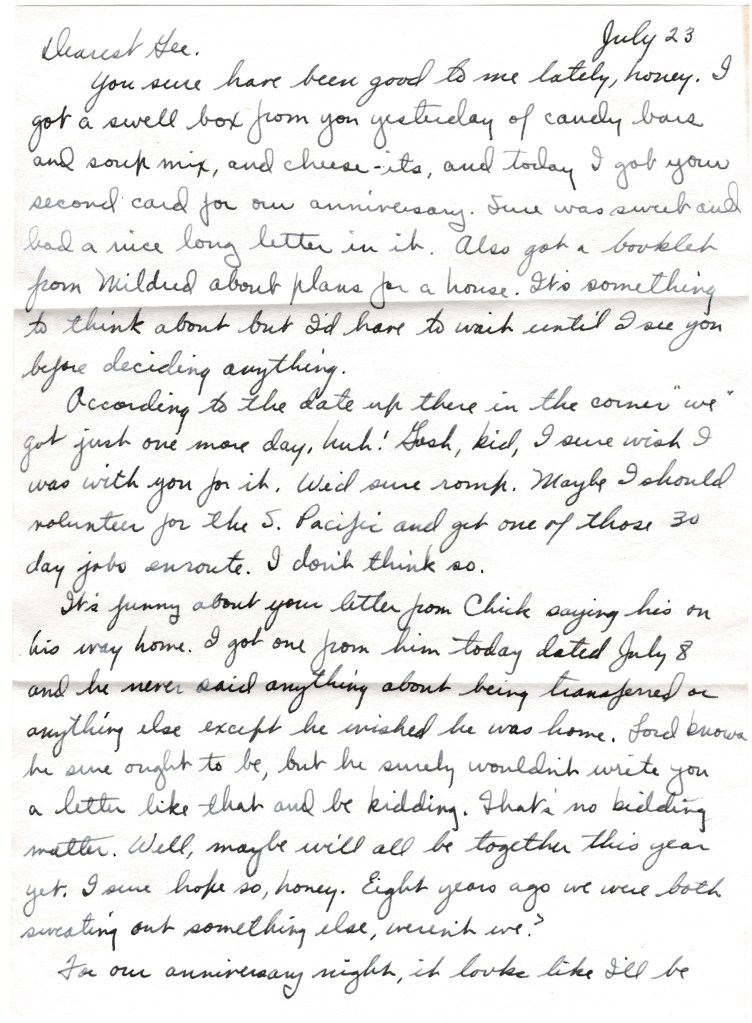 It’s funny about your letter from Chick saying he’s on his way home. I got one from him today dated July 8 and he never said anything about being transferred or anything else except he wished he was home. Lord knows he sure ought to be, but he surely wouldn’t write you a letter like that and be kidding. That’s no kidding matter. Well, maybe we’ll all be together this year yet. I sure hope so, honey. Eight years ago we were both sweating out something else, weren’t we?