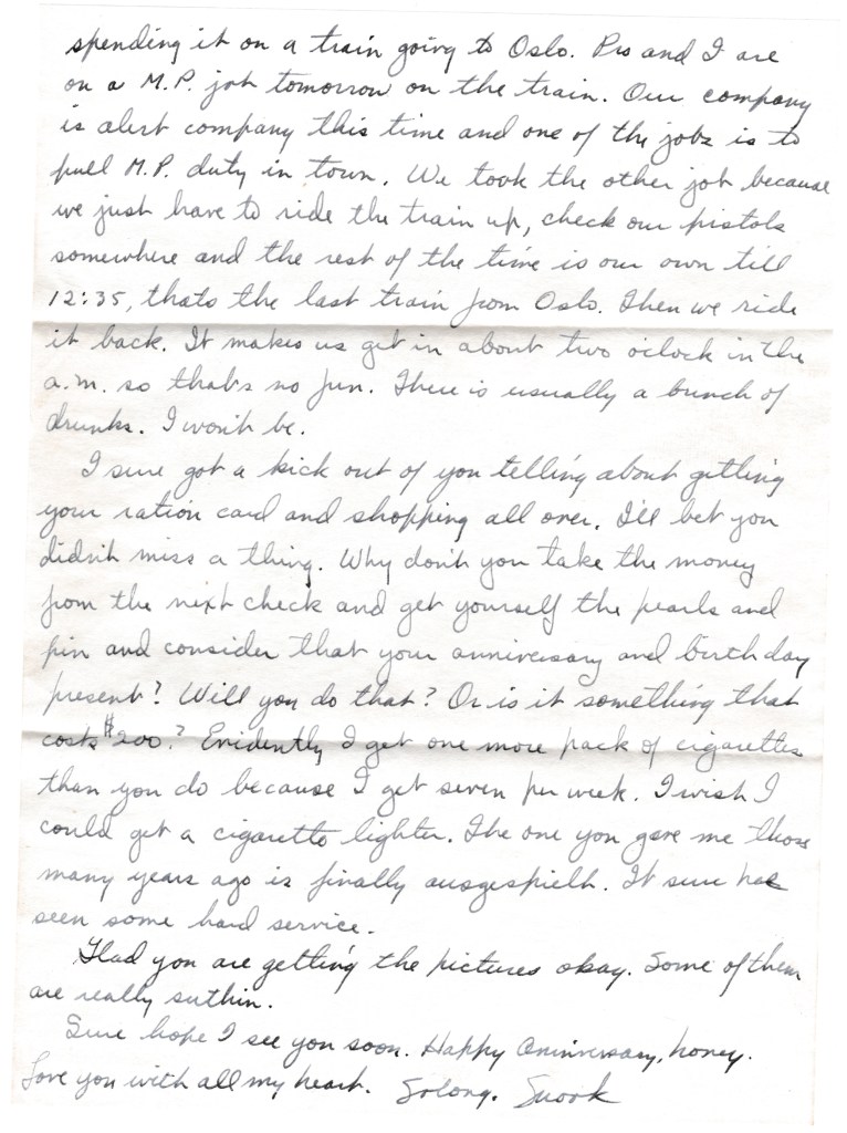 For our anniversary night, it looks like I’ll be spending it on a train going to Oslo. Pro and I are on a M.P. job tomorrow on the train. Our company is alert company this time and one of the jobs is to pull M.P. duty in town. We took the other job because we just have to ride the train up, check our pistols somewhere and the rest of the time is our own till 12:35, that’s the last train from Oslo. Then we ride it back. It makes us get in about two o’clock in the a.m. so that’s no fun. There is usually a bunch of drunks. I won’t be.