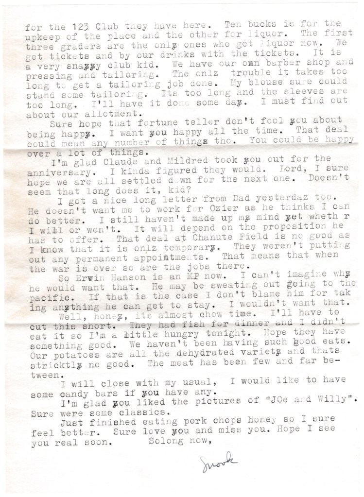 I got a nice long letter from Dad yesterday too. He doesn’t want me to work for Ozier as he thinks I can do better. I still haven’t made up my mind yet whether I will or won’t. It will depend on the proposition he has to offer. That deal at Chanute Field is no good as I know that it isn only temporary. They weren’t putting out any permanent appointments. That means that when the war is over so are the jobs there.