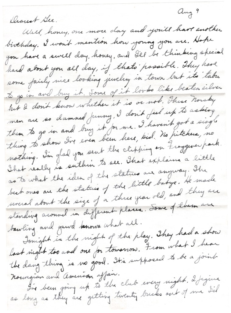 Well, honey, one more day and you’ll have another birthday. I won’t mention how young you are. Hope you have a swell day, honey, and I’ll be thinking special hard about you all day, if that’s possible. They have some fairly nice looking jewelry in town but it’s tabu to go in and buy it. Some of it looks like beaten silver but I don’t know whether it is or not. These Norsky men are so damned funny, I don’t feel up to asking them to go in and buy it for me. I haven’t got a single thing to show I’ve even been here, kid. No pitchers, no nothing. I’m glad you sent the clipping on the Froggener [Frogner] park. That was really something to see. That explains a little as to what the idea of the statues are anyway. The best ones are the statues of the little bab[ies]. He made several about the size of a three year old, and they are standing around in different places. Some of them are bawling and gawd knows what all.