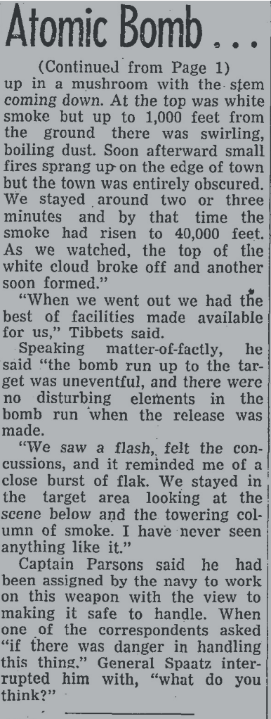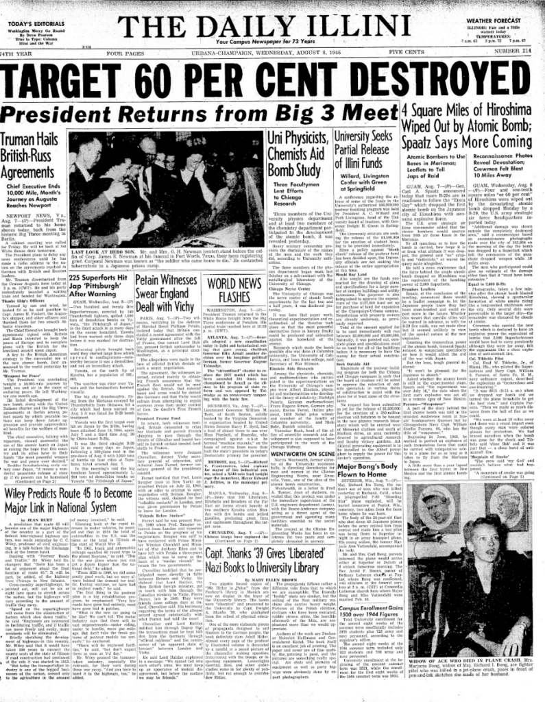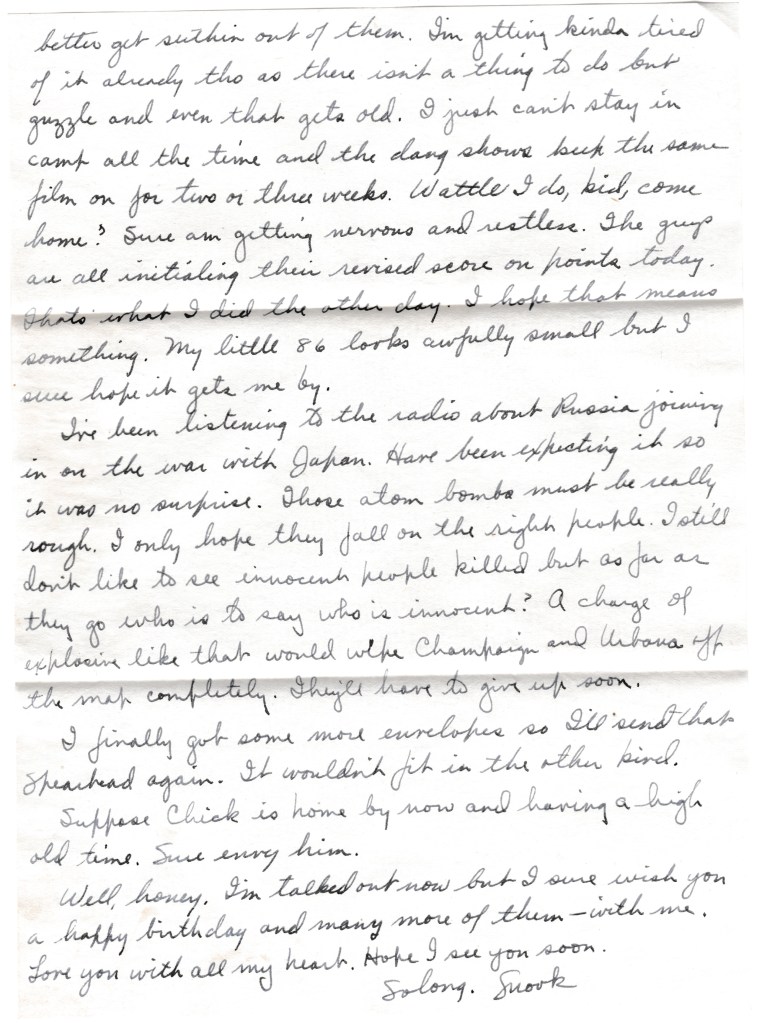 I’ve been listening to the radio about Russia joining in on the war with Japan. Have been expecting it so it was no surprise. Those atom bombs must be really rough. I only hope they fall on the right people. I still don’t like to see innocent people killed but as far as they go who is to say who is innocent? A charge of explosive like that would wipe Champaign and Urbana off the map completely. They’ll have to give up soon.