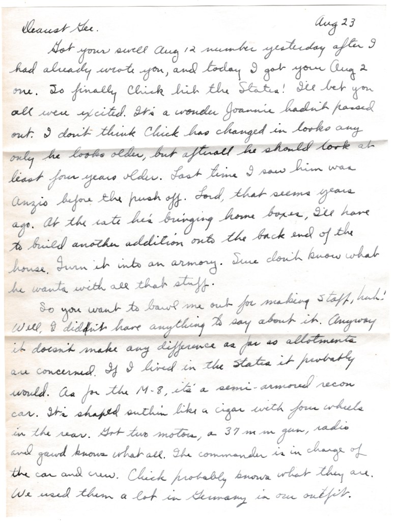 Got your swell Aug 12 number yesterday after I had already wrote you, and today I got your Aug 2 one. So finally Chick hit the States! I’ll bet you all were excited. It’s a wonder Joannie hadn’t passed out. I don’t think Chick has changed in looks any only he looks older, but after all he should look at least four years older. Last time I saw him was Anzio before the push off. Lord, that seems years ago. At the rate he’s bringing home boxes, I’ll have to build another addition onto the back of the house. Turn it into an armory. Sure don’t know what he wants with all that stuff.