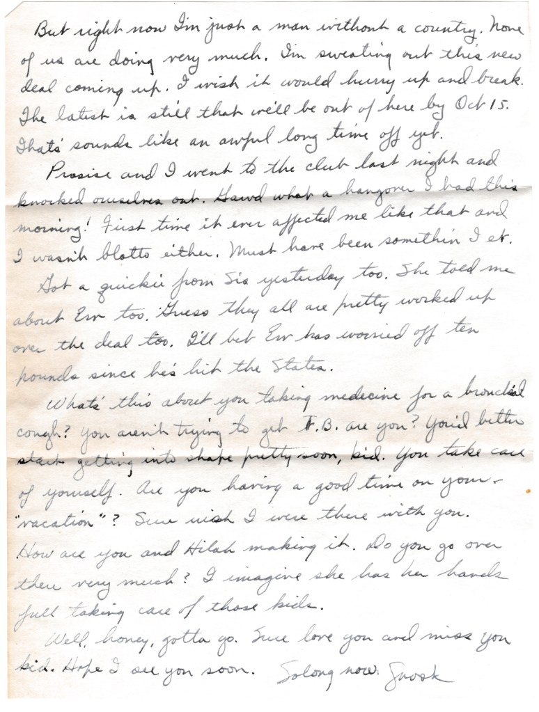 What’s this about you taking medicine for a bronchial cough? You ain’t trying to get T.B. are you? You’d better start getting into shape pretty soon, kid. You take care of yourself. Are you having a good time on your “vacation”? Sure wish I were there with you. How are you and Hilah making it. Do you go over there very much? I imagine she has her hands full taking care of those kids.