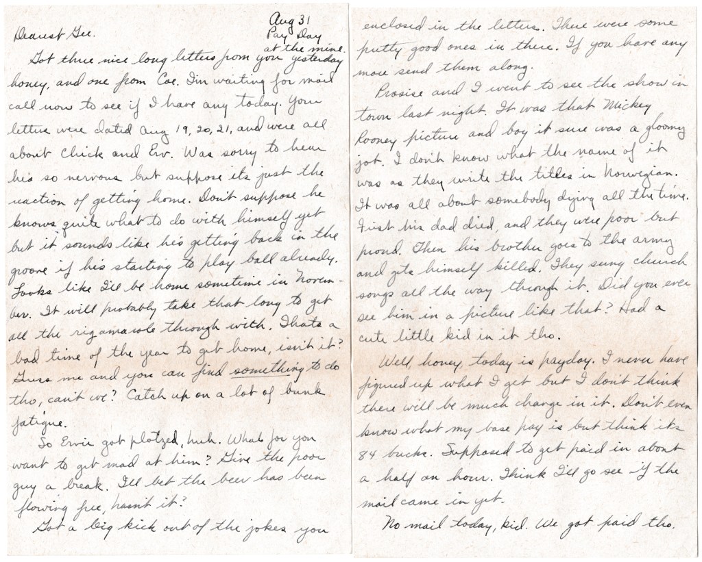Got three nice long letters from you yesterday honey, and one from Coe. I’m waiting for mail call now to see if I have any today. Your letters were dated Aug 19, 20, 21, and were all about Chick and Erv. Was sorry to hear he’s so nervous but suppose it’s just the reaction of getting home. Don’t suppose he knows quite what to do with himself yet but it sounds like he’s getting back in the groove if he’s starting to play ball already. Looks like I’ll be home sometime in November. It will still probably take that long to get all the rigamarole through with. That’s a bad time of the year to get home, isn’t it? Guess me and you can find something to do tho, can’t we? Catch up on a lot of bunk fatigue.