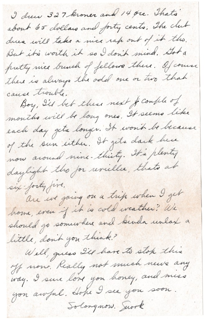 No mail today, kid. We got paid tho. I drew 327 kroner and 14 øre. That’s about 65 dollars and 40 cents. The club dues will take a nice rap out of it tho. But it’s worth it so I don’t mind. Got a pretty nice bunch of fellows there. Of course there is always the odd one or two that cause trouble.